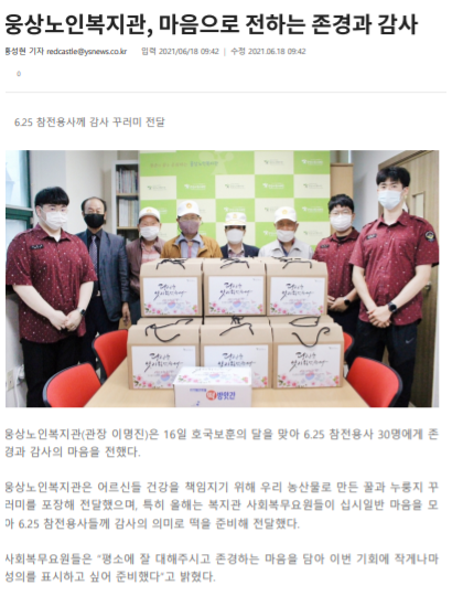 (양산시민신문) 웅상노인복지관, 마음으로 전하는 존경과 감사 스크랩 2021.06.25 댓글 키꼬 목차 웅상노인복지관, 마음으로 전하는 존경과 감사 웅상노인복지관은 어르신들 건강을 책임지기 위해 우리 농산물로 만든 꿀과 누룽지 꾸러미를 포장해 전달했으며, 특히 올해는 복지관 사회복무요원들이 십시일반 마음을 모아 6.25 참전용사들 www.ysnews.co.kr 공유하기 게시글 관리 키크고 싶은 꼬마이야기 저작자표시 비영리 동일조건 (새창열림) 스크랩 카테고리의 다른 글 (양산신문) 양산시복지재단, 현장 안전점검 실시 2024.07.27 (양산신문) 원활한 시설 운영 및 이용자 안전에 철저 2023.06.28 [울산교육] 제1회 전국상업정보경진대회 울산 학생 5명 입상[출처] 제1회 전국상업정보경진대회 울산 학생 5명 입상 2021.04.27 (뉴시스)전국상업정보경진대회 울산 학생 5명 입상 2021.04.05 댓글보기