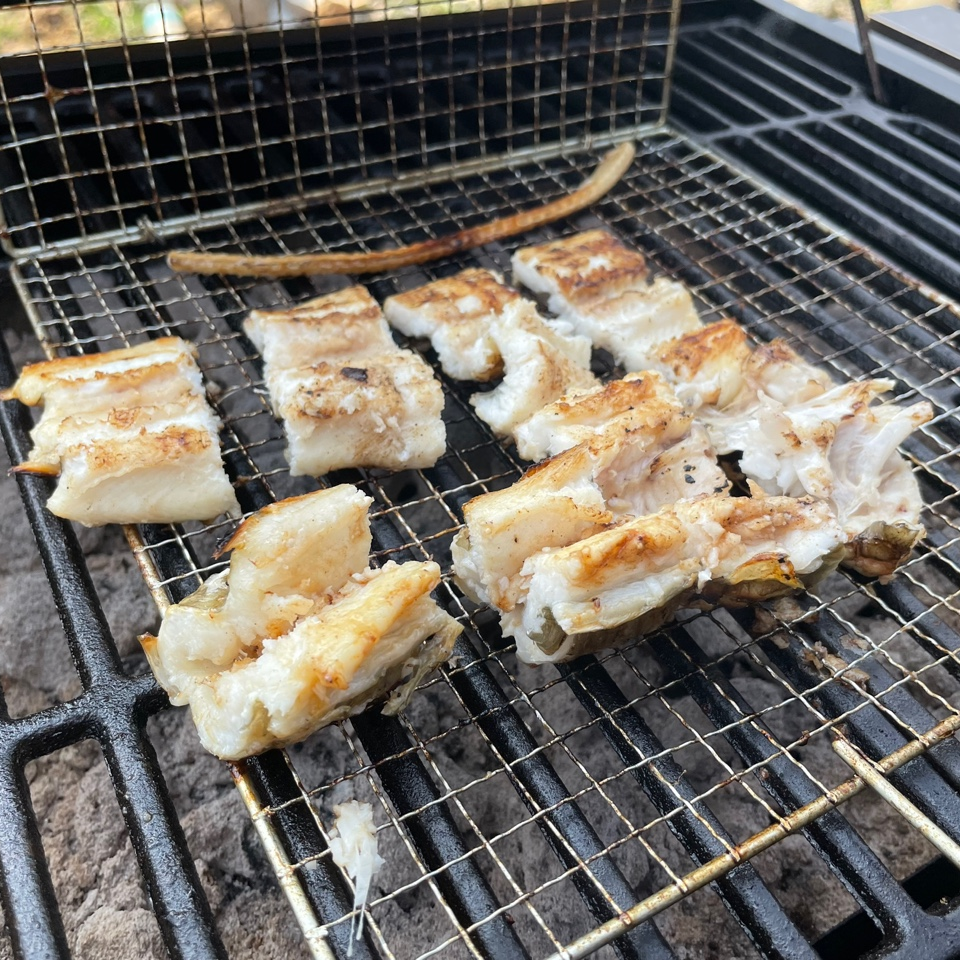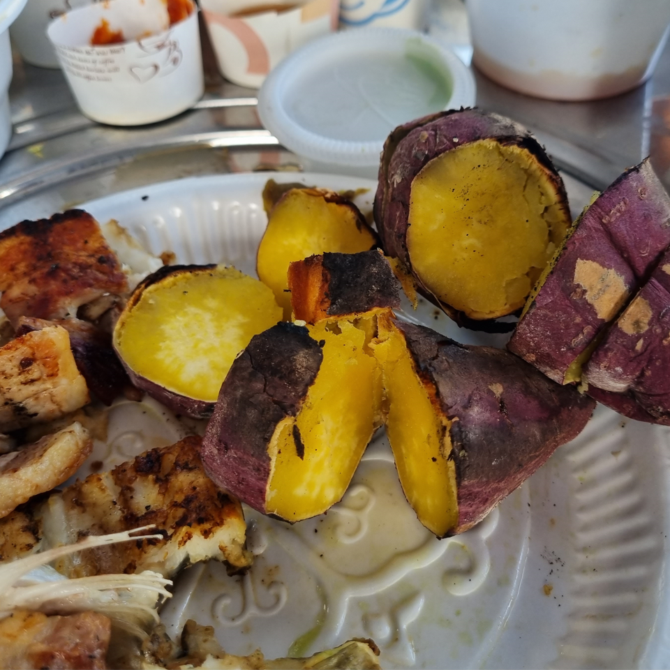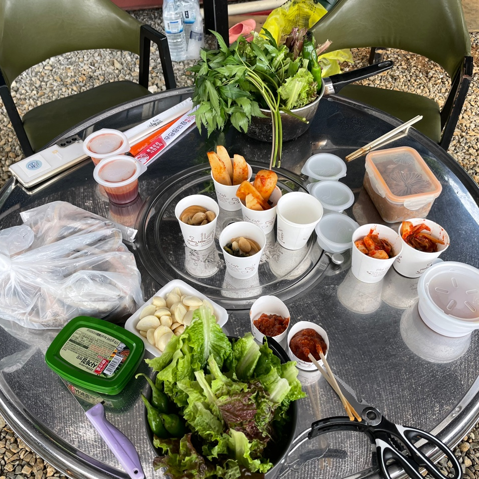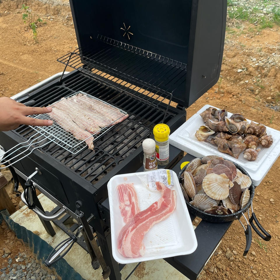 오늘의 메뉴는 숯불직화 삼겹살, 장어구이, 장어 숯불구이, 장어 뼈 구이, 소라, 가리비, 해물라면, 비빔면, 비비고 된장찌개 + GGG, 숯불직화 고구마 등등 엄청난 요리를 즐겼습니다.