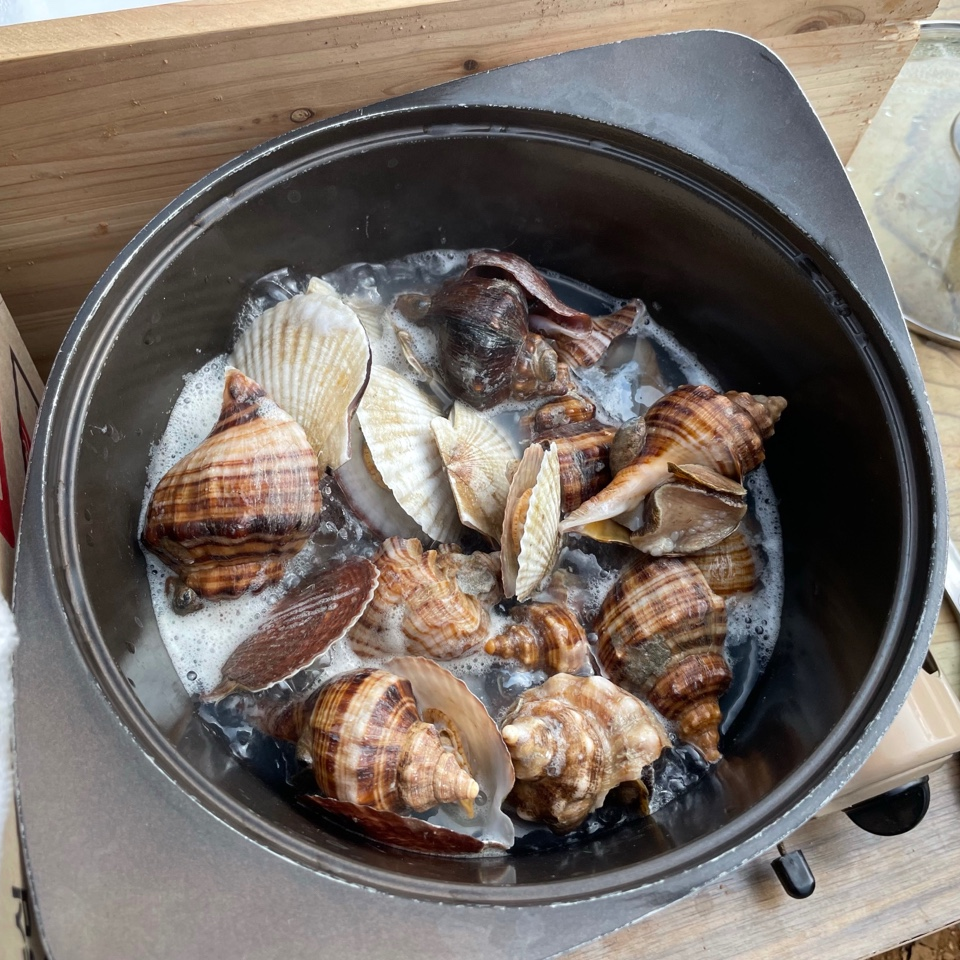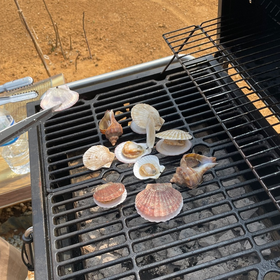 오늘의 메뉴는 숯불직화 삼겹살, 장어구이, 장어 숯불구이, 장어 뼈 구이, 소라, 가리비, 해물라면, 비빔면, 비비고 된장찌개 + GGG, 숯불직화 고구마 등등 엄청난 요리를 즐겼습니다.