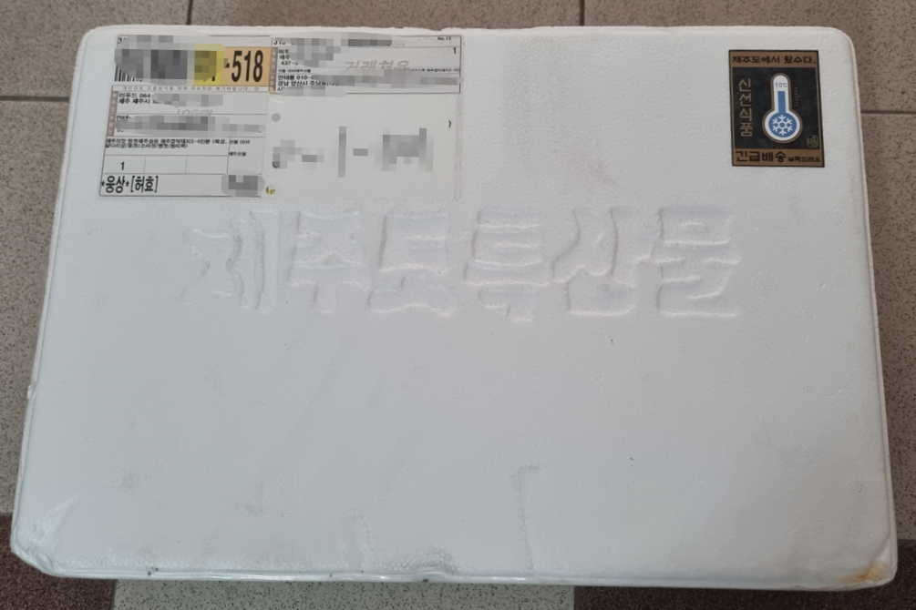 "두둥" 제주도 특산물이라고 적힌 아이스박스가 문 앞에 딱 있지 말입니다??