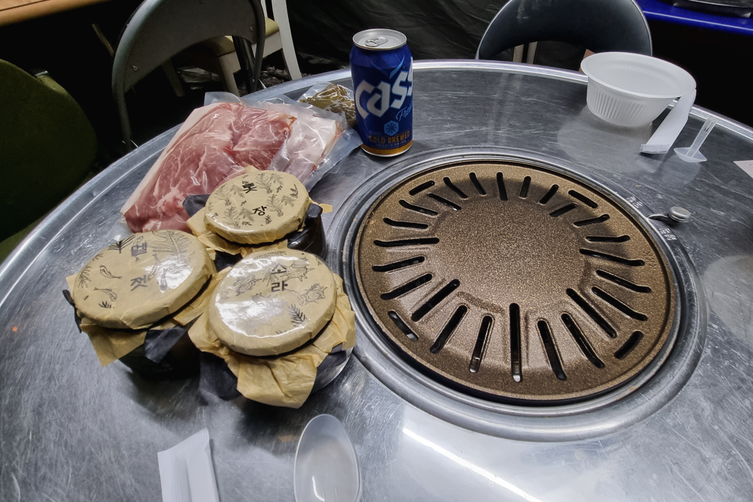 우선 고기와 장들을 준비하고 불을 지펴봅니다.
