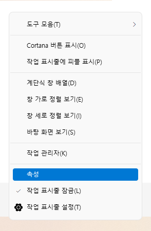 만약 꺼버리셧다면 작업표시줄 오른쪽을 누르면 작업표시줄 설정이 아닌 속성이라는 메뉴를 클릭해주어야합니다.