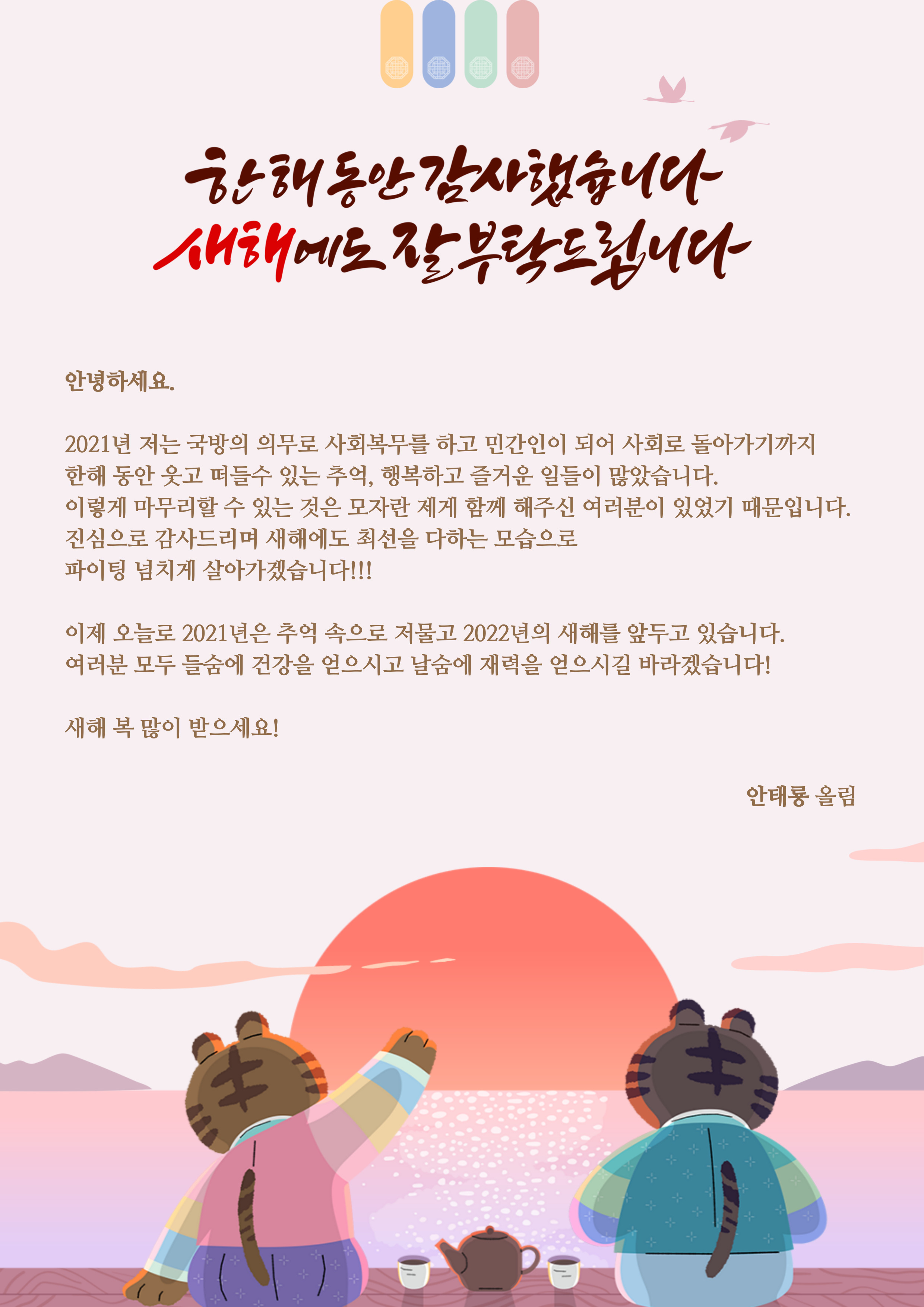 2021년 한해 감사하였습니다. 2022년에도 잘 부탁드립니다. 일상다만사 2021.12.31 댓글 키꼬 목차 안녕하세요 키꼬입니다.2021년 한해 감사하였습니다. 2022년에도 잘 부탁드립니다.새해 복 많이받으세요! 공유하기 게시글 관리 키크고 싶은 꼬마이야기 저작자표시 비영리 동일조건 (새창열림) 일상다만사 카테고리의 다른 글 [자원봉사일기] 재능기부 크리에이터로 (feat.웅상노인복지관TV) 2022.01.29 5년만의 변화... 키큰아이 신규 SI 적용. 2022.01.28 [추억일기] 지금은 클라우드서비스를 쓰지만... 2021.12.23 (가을산행) 경기도와 강원도사이 명성산에 다녀오다. 2021.12.01 댓글보기