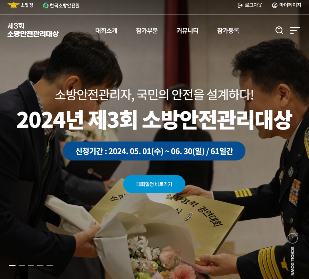 사실 소방안전관리자 보수교육을 듣기 위해 소방안전원 누리집에 들어갔다가 우연히 알게 되었고 공모도 비교적 간단히 소방안전계획서, 소방안전관리와 관련된 활동 내역을 붙여 대회참가가 가능했다는 점이었습니다.