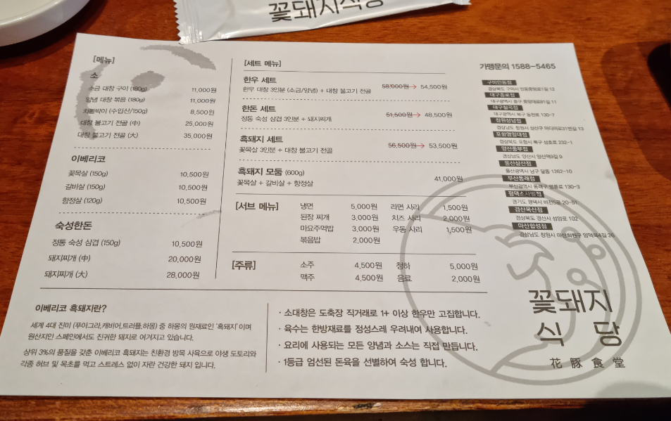 우선 테이블에 놓인 메뉴판을 함 쭈욱 보고 한돈 세트에 꽃 목살 2인분을 곁들였습니다.