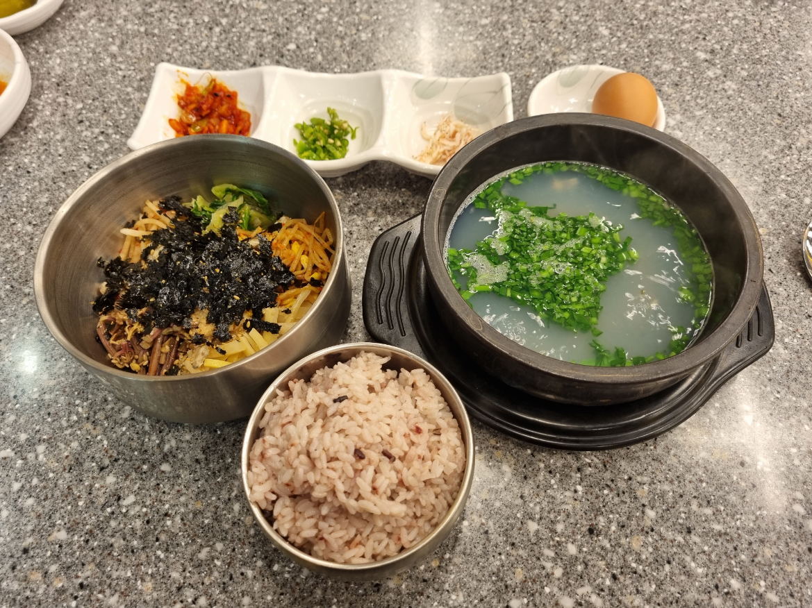 친구는 김치 콩나물국밥 그리고 추가 돈가스를 시키고 저는 재첩 비빔 세트를 시켰습니다.