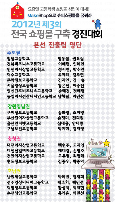 2012년 제3회 전국 쇼핑몰 구축 경진대회 본선 진출팀 명단 수도권 청담고등학교 임동섭, 권유림 경복비즈...