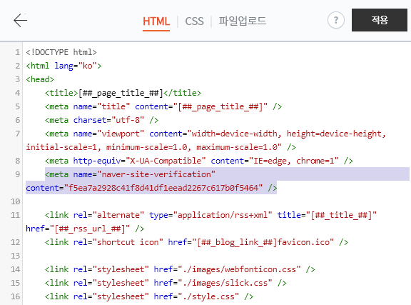 지금 위에 파란 부분이 아까 복사한 메타태그입니다. 저렇게 삽입하고 적용을 눌러주세요!
