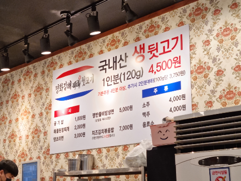 120g당 4,500원 두지점 동일하고 초벌 그리고 첫판은 테이블에서 구워주시는데요.