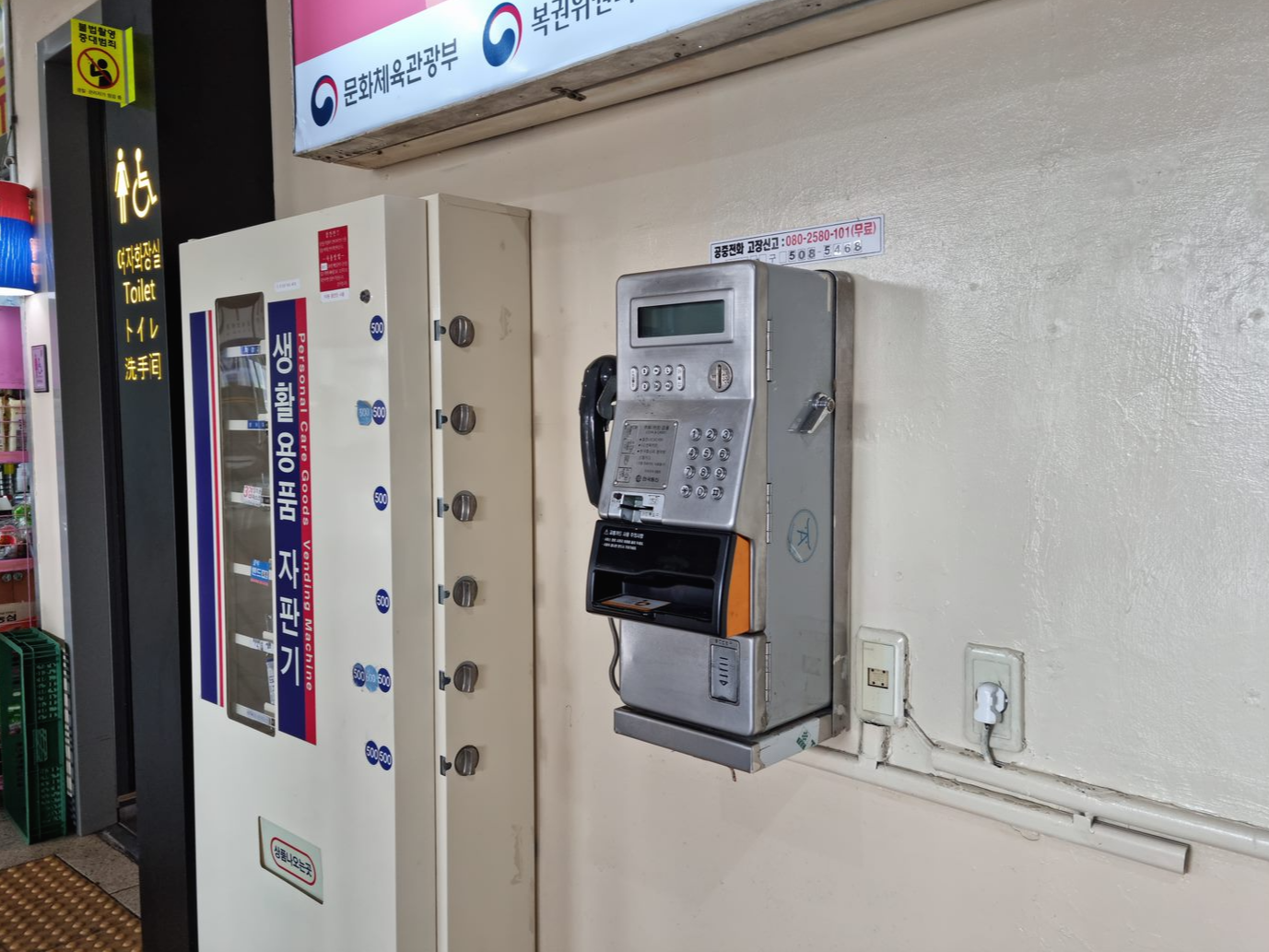 버스 타기 전 화장실을 들리기 위해 화장실 앞으로 가니 공중전화가 벽에 붙어있네요!